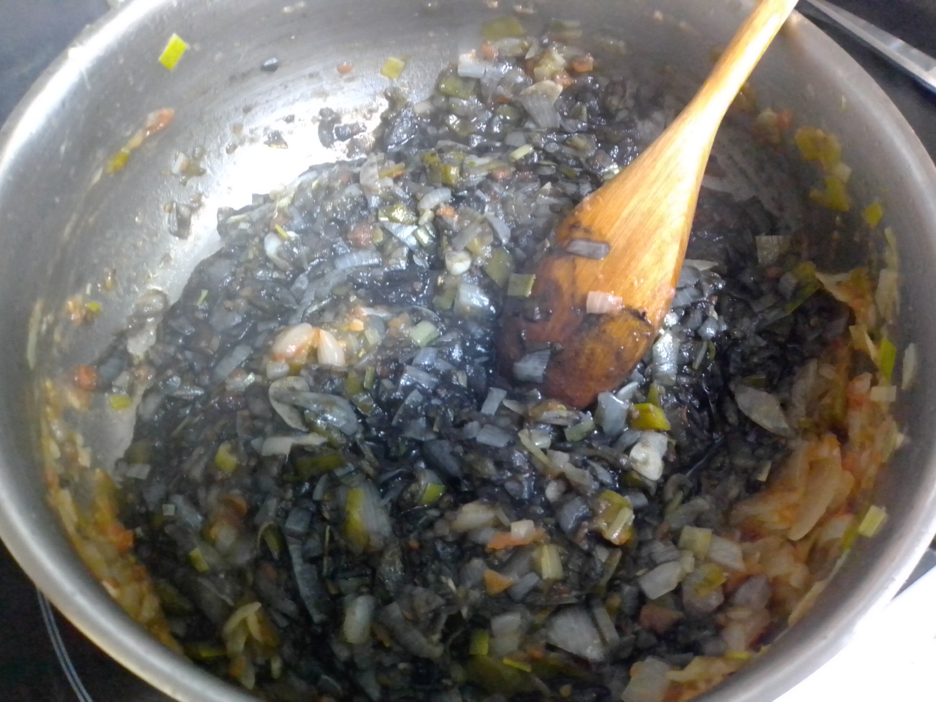 ml de vino blanco, la tinta de los calamares, sal, aceite y perejil.